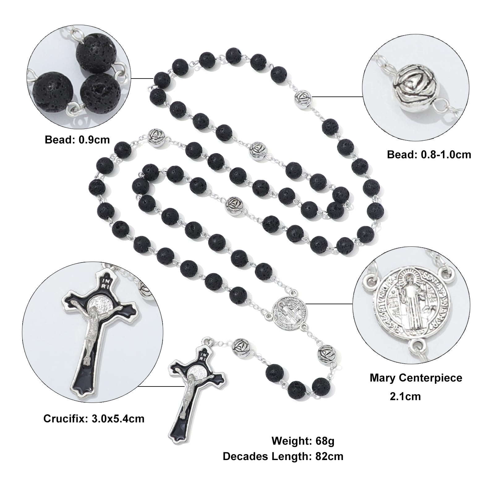 - Volcanic Rock Rosary: The catholic rosary is made of 53 black volcanic rock beads and 6 silver-tone rose flower beads; with St.Benedict medal and Jesus crucifix cross; not easy to fade, not easy to knot and break