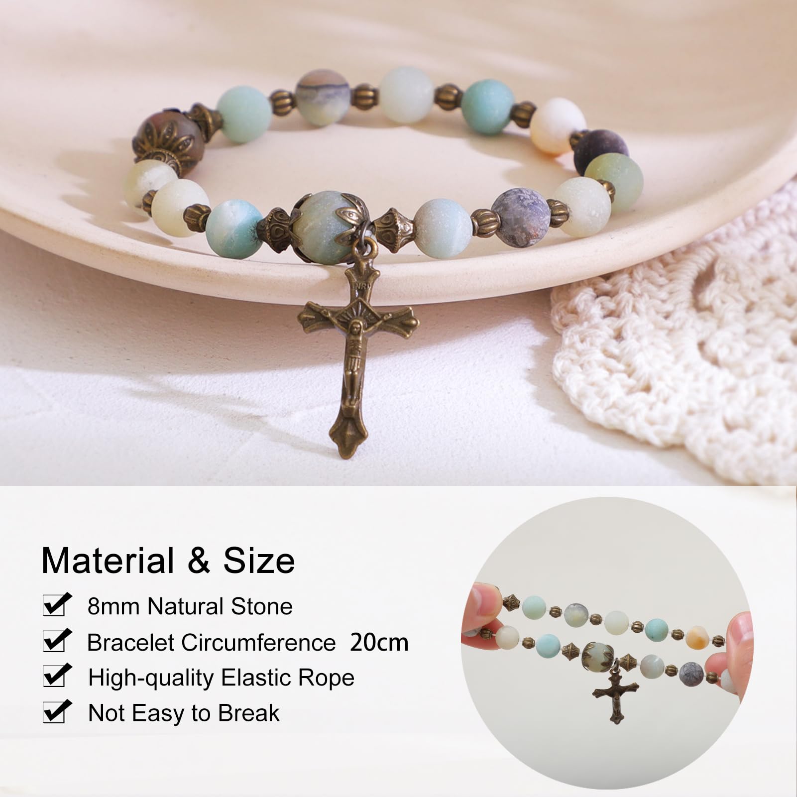 KOMI Gemstone Beaded Stretch Bracelet 8mm & 10mm Beads Rosary Bracelet with Crucifix Cross, Beads Bracelet for Women & Men Catholic Religious Jewelry