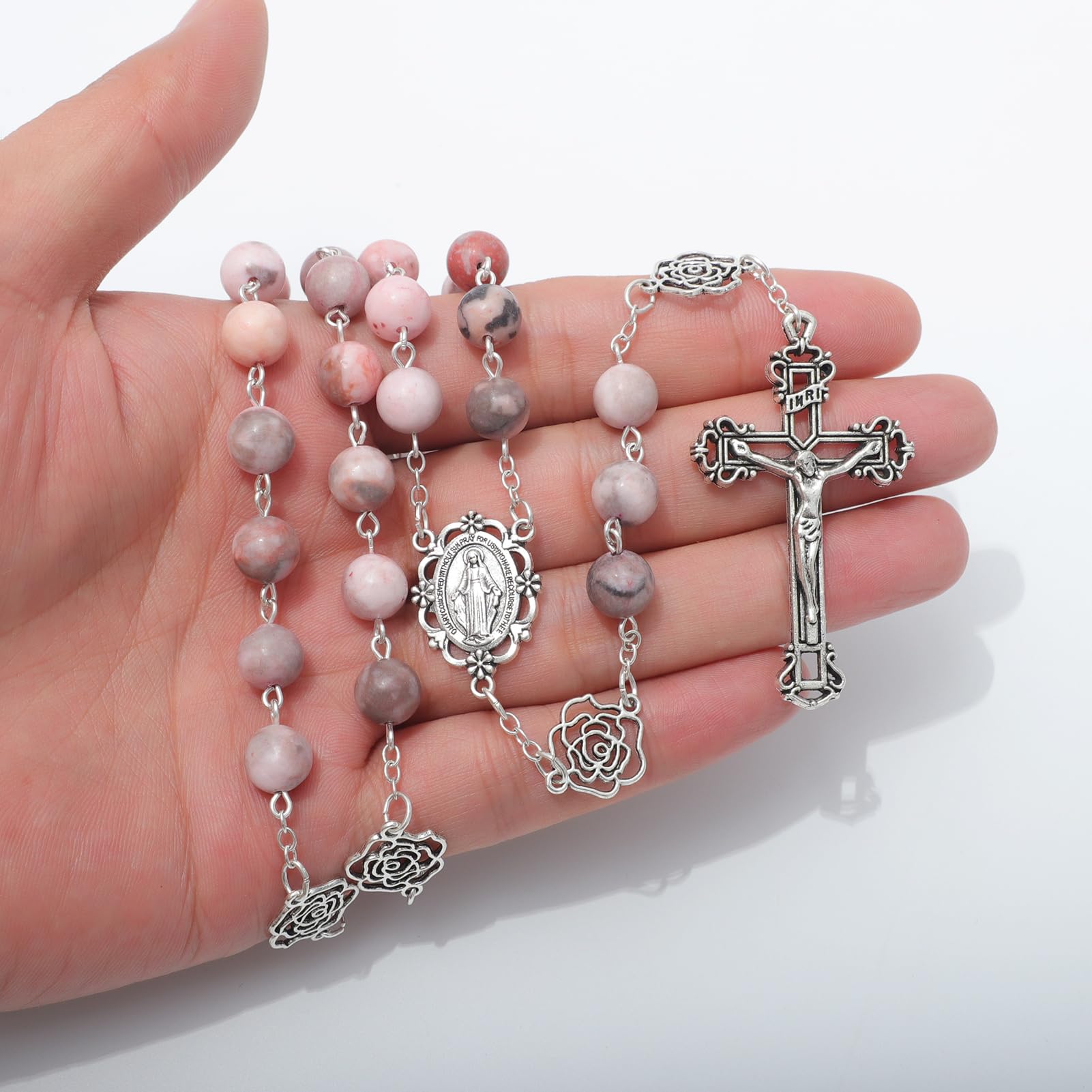 - Catholic Rosary: The catholic rosary is made of 53 pink stone beads and 6 rose metal beads, adorned with Virgin Mary medal and Jesus crucifix cross, this is an exquisitely designed rosary with a luxury, weighty feel