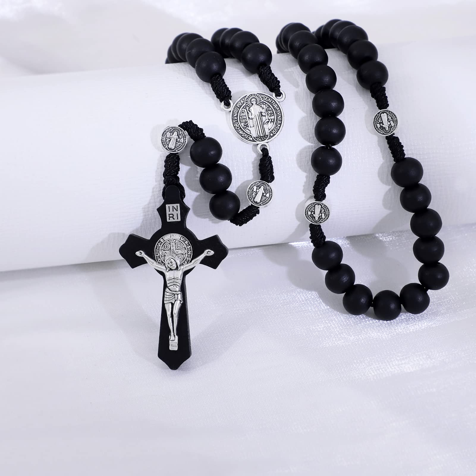 - DESIGN – Brown wood Rosary with St. Benedict Metal and Jesus Crucifix Cross. The beads are made of solid pine wood, and each bead is round and smooth after careful polishing. Wooden rosaries are all handmade, the braided thread is tight and firm, durable.