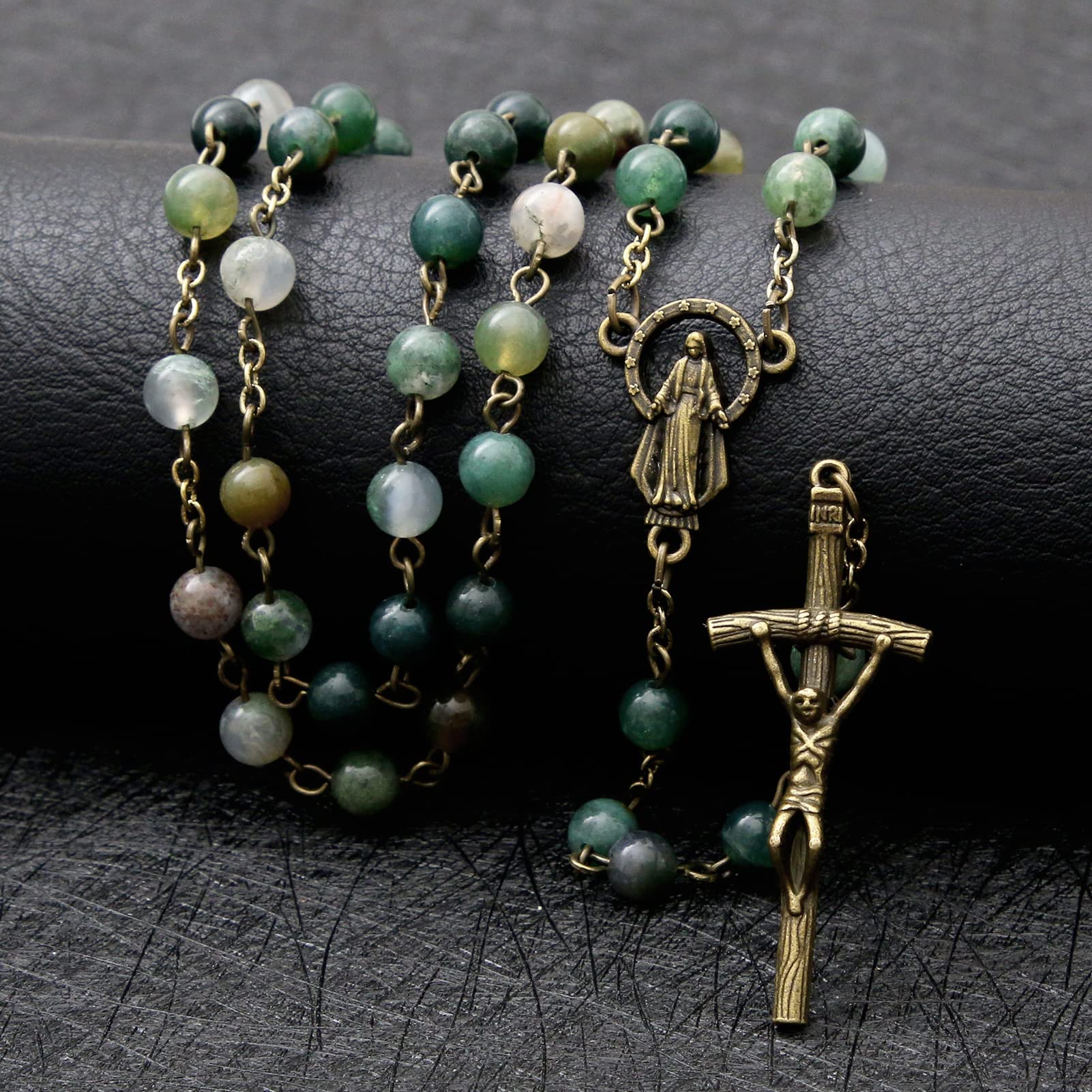 - 6mm round agate stone beads rosary catholic necklace with Mary medal and Jesus crucifix.