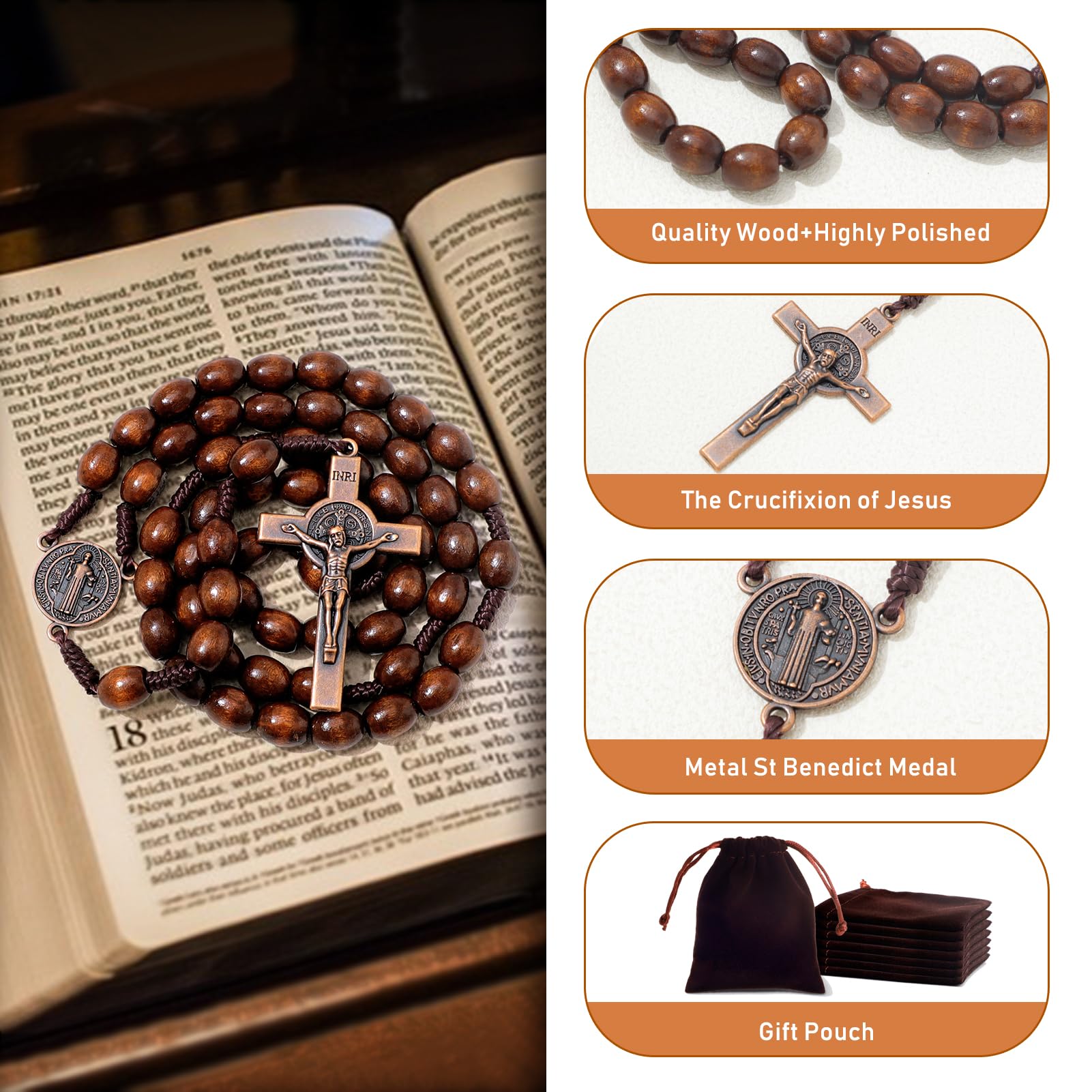 KOMI Wood Rosary Beads Bulk for Men,Catholic Prayer Pocket Rosary,Handmade Wooden Rosary with St Benedict Medal and Crucifix Cross